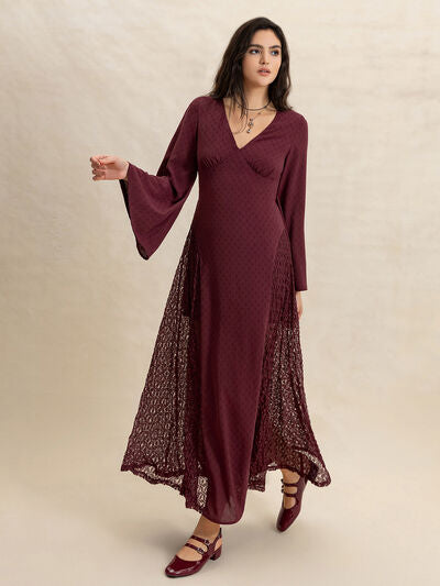 Lace Patchwork V-Neck Long Sleeve Midi Dress